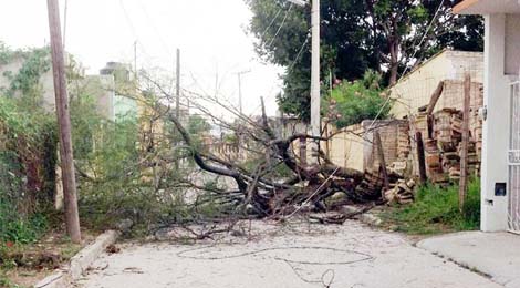 El árbol quedó atravesado, causó daños en cableado José Ángel Mtz.- Advertencia a responsables de árboles y bardas que presentan riesgo para la población, hacen vecinos de la calle Victoria,…