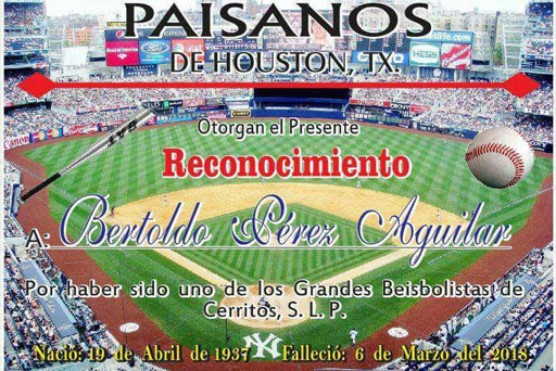 Es considerado uno de los mejores beisbolistas que ha dado Cerritos Por MARCO SERNA.- Paisanos de Houston Texas rindieron homenaje póstumo a Bertoldo Pérez Aguilar, conocido como La Torica, considerado…
