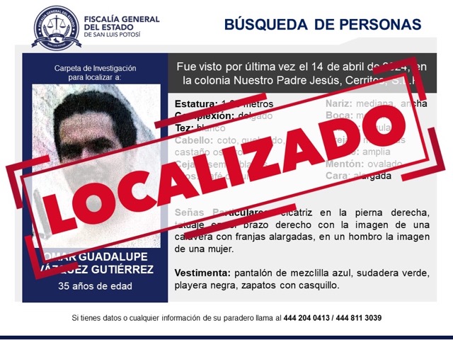 La Fiscalía General del Estado ha confirmado la localización de Omar Guadalupe Vázquez Gutiérrez, de 35 años, quien había desaparecido el 14 de abril de 2024. La última vez que se le vio fue en la colonia Nuestro Padre Jesús, en Cerritos, y su ausencia generó una movilización comunitaria y familiar para encontrarlo.