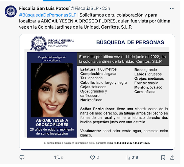 La Fiscalía General del Estado de San Luis Potosí lanzó una ficha de búsqueda el martes 26 de marzo de 2024 a través de sus redes sociales, solicitando ayuda para localizar a Abigaíl Yesenia Orosco Flores, una joven de Cerritos desaparecida desde el 11 de junio de 2022.