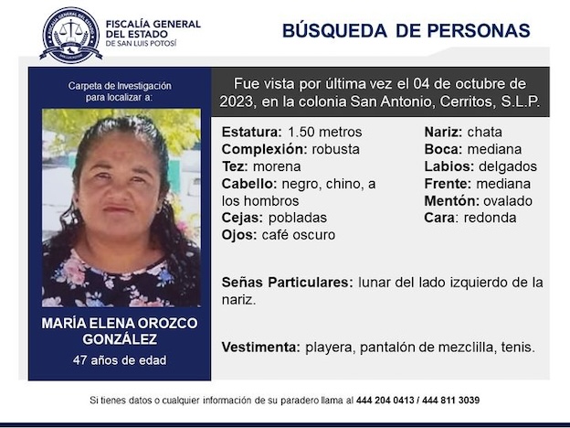 La Fiscalía General del Estado de San Luis Potosí mantiene abierta una carpeta de investigación para localizar a María Elena Orozco González, de 47 años de edad, quien fue vista por última vez el 4 de octubre de 2023, en la colonia San Antonio, del municipio de Cerritos.