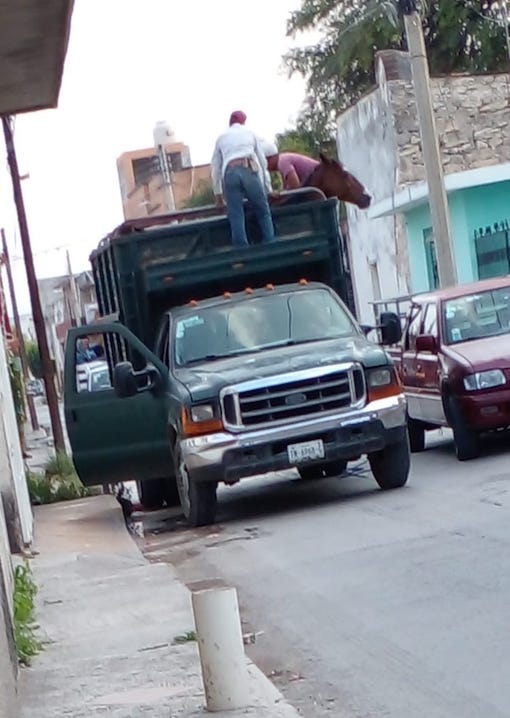 Un penco estuvo a punto de saltar de la parte trasera de una camioneta en marcha, que lo transportaba suelto en un espacio donde con facilidad caben unos cinco equinos o reses. El hecho ocurrió el miércoles 31 de mayo, alrededor de las 5:45 pm, por la calle Abasolo, en Cerritos.