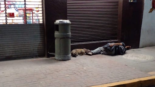 Un hombre joven que sufre problemas de alcoholismo regresó a dormir frente al Oxxo de Cerritos, después de haber estado ausente por cerca de dos meses. El indigente se acompaña de una mascota, un perro que lo sigue a todas partes.