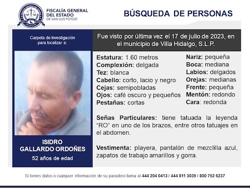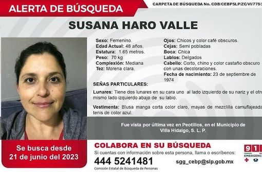 La Comisión de Búsqueda de Personas de San Luis Potosí emitió una alerta de búsqueda para localizar a Susana Haro Valle, de 48 años, quien fue vista por última vez el 21 de junio en la comunidad de Peotillos, en el municipio de Villa Hidalgo, San Luis Potosí.