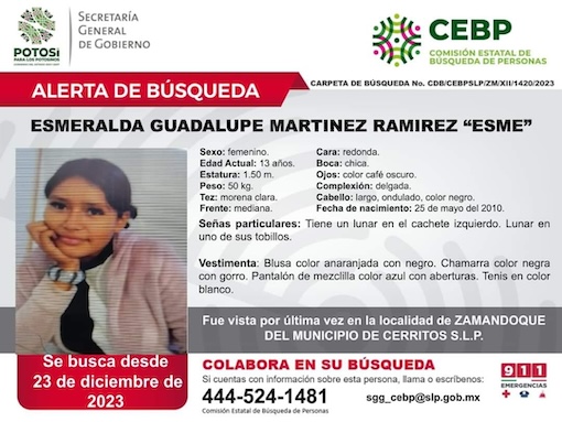 Esmeralda Guadalupe Martínez Ramírez, una joven de 13 años originaria de la comunidad de El Zamandoque, fue localizada, después de estar desaparecida desde el 23 de diciembre. La menor se encontraba con una amiga en la colonia Guadalupe, en la cabecera municipal de Cerritos, sin que se conozca el motivo por el que se fue con ella.