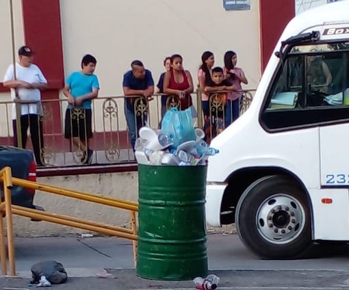 Los tambos de basura de la plaza principal de Cerritos lucen llenos para antes de las 8:00 de la noche. Los visitantes de la feria patronal en honor a San Juan Bautista tienen que soportar el desorden que provocan los desechos.
