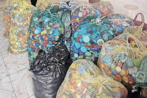 Pareja de adultos se ha dado a la tarea de reunir tapitas de plástico, mismas que sirven como apoyo para niños que padecen cáncer.