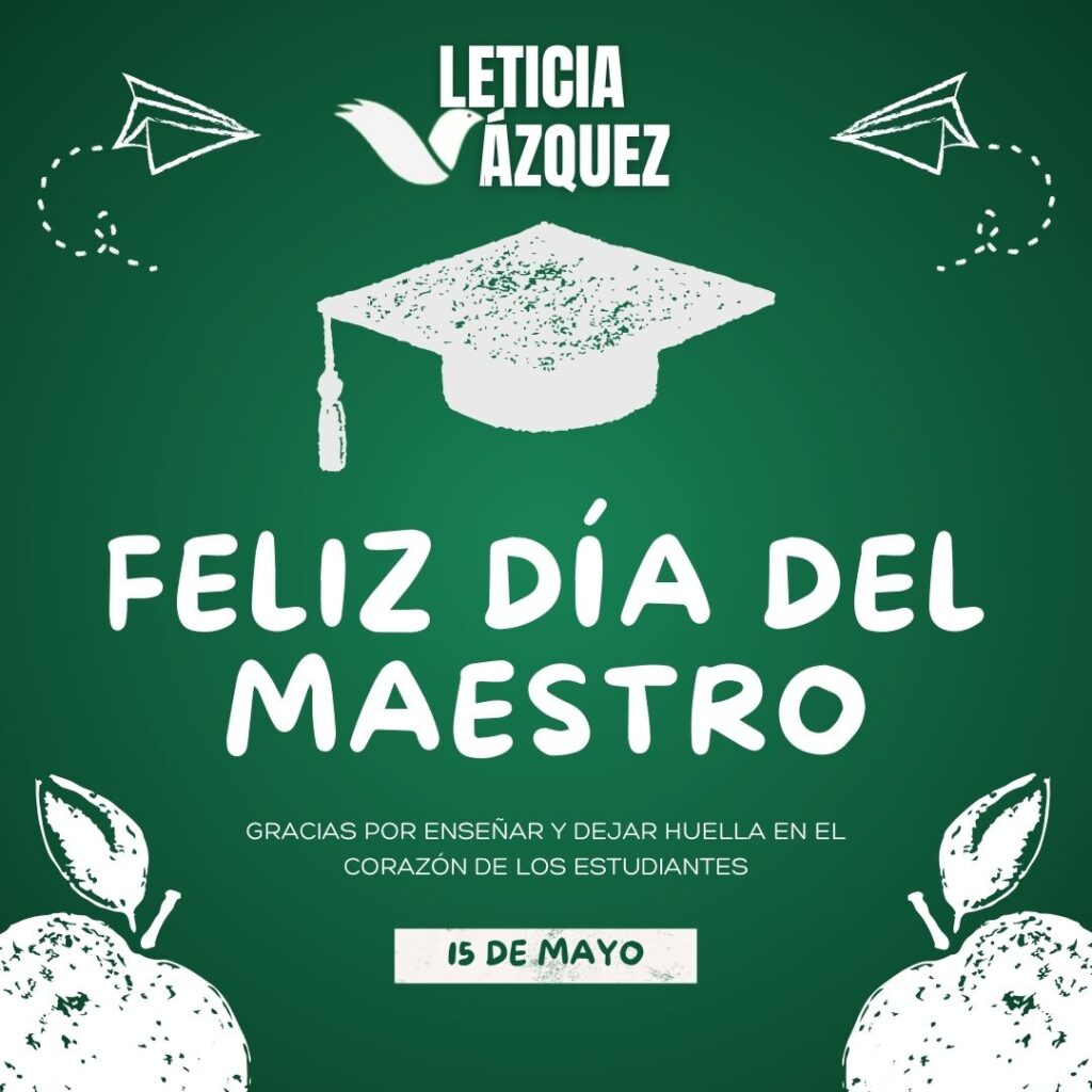 Lety Vázquez, representante de la coalición Sigamos Haciendo Historia, integrada por los partidos PVEM, Morena y PT, en su búsqueda por la diputación local del XI Distrito Electoral, ha compartido sus actividades recientes y un mensaje de felicitación a los maestros en su día.