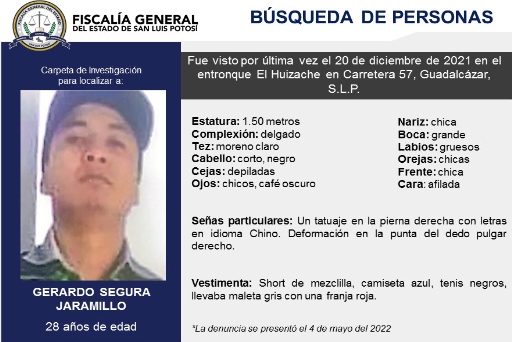 La Fiscalía General del Estado abrió carpeta de investigación para encontrar a Gerardo Segura Jaramillo, quien fue visto en el entronque de El Huizache, Guadalcázar.