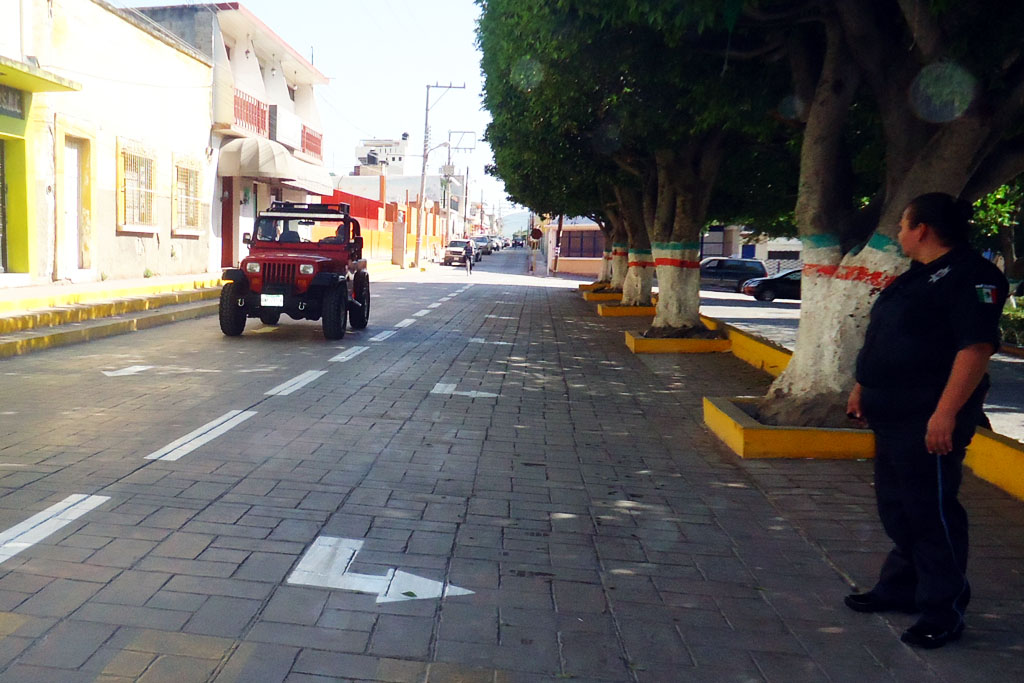 Se delimitó la calle jardín Hidalgo entre Guerrero y Morelos con una franja blanca pintada justo a la mitad, para separar la calle en dos carriles.