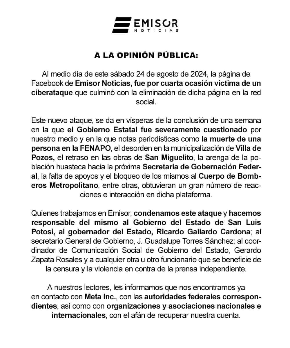 “Este nuevo ataque, se da en vísperas de la conclusión de una semana en la que el Gobierno Estatal fue severamente cuestionado por nuestro medio y en la que notas periodísticas como la muerte de una persona en la FENAPO, el desorden en la municipalización de Villa de Pozos, el retraso en las obras de San Miguelito, la arenga de la población huasteca hacia la próxima Secretaria de Gobernación Federal, la falta de apoyos y el bloqueo de los mismos al Cuerpo de Bomberos Metropolitano, entre otras notas, que obtuvieran un gran número de reacciones e interacción en dicha plataforma”, indica el comunicado de Emisor Noticias, sin embargo, esta afectación solo sucede en Facebook, donde se recomiendan algunas medidas de seguridad para evitar estos ciberataques, pues la página oficial www.emisornoticias.mx sigue intacta. Además, se desconoce qué tipo de pruebas se tienen para responsabilizar al gobierno, en un entorno digital donde los espacios de Facebook, Twitter, Youtube y Tiktok de cientos de medios y de miles de ciudadanos son contrapeso para el poder.