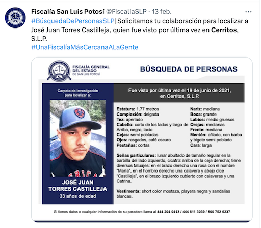 La Fiscalía San Luis Potosí ha vuelto a publicar datos de la carpeta de investigación para encontrar a José Juan Torres Castilleja, quien fue visto por última vez en Cerritos el 19 de junio de 2021. También conocido como "Juan Pequeño", este es uno de los varios casos de desapariciones en la región.
